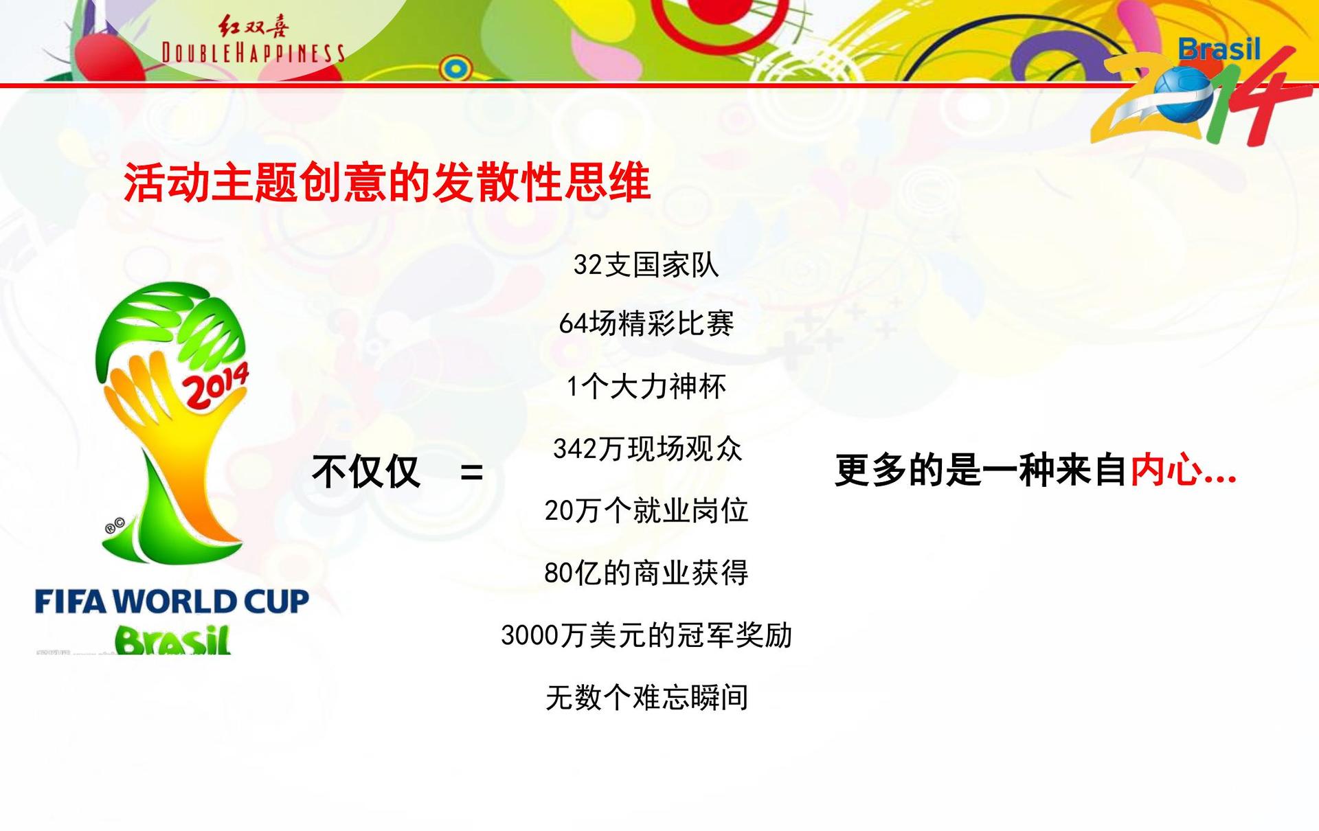 4、在喧宾夺主的策略中,对于非赞助商企业而言,通过举办与世界杯主题相关的活动,并辅以大规模的线上线下营销传播,可以实现“喧宾夺主”的效果以耐克与百事可乐为例,在2002年韩日世界杯期间,耐克通过举办“民间”五人制足球比赛,以强悍的广告攻势,取得了超过官方赞助商阿迪达斯的营销成果百事可乐在;赛事活动策划是指为了组织管理和推广某项赛事而进行的详细计划和安排具体来说它是为了提升品牌或活动的知名度就像给一场盛大的聚会做准备,赛事活动策划通过精心设计和创意,让这场“聚会”更加吸引人,从而提高企业或品牌的知名度它涵盖了赛事的方方面面从赛事的主题确定规则制定,到赛程。